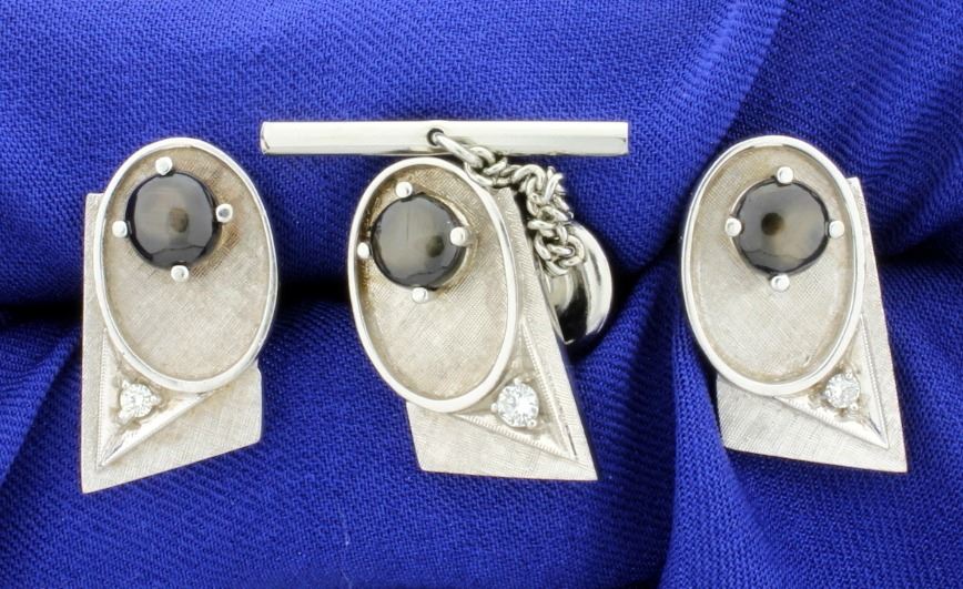 They are 14K white gold, and contain three 7mm cabochon black sapphires, also contains four .1ct diamonds, and two .05ct diamonds-all high quality VS clarity/H color. Cufflinks and tie tack are 1 inch long each. 25.0g