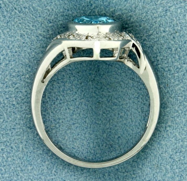 In 14k white gold. Contains a 10x7mm 2ct pear shaped blue topaz gemstone with bright color and excellent cut giving it lots of sparkle and brilliance. Also contains ten high quality diamonds, .05 ct TW. 4.7g.