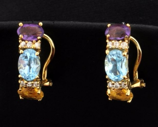 In 14K yellow gold, each earring contains six .01ct diamonds along with a 1ct blue topaz, 1/2ct amethyst, and 1/2ct citrine gemstone. These earrings have safety backs for stability. 4.0g