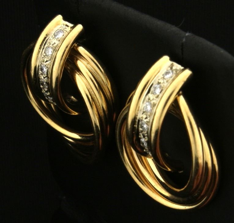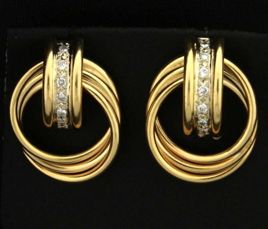 In 14k yellow gold, containing fourteen high quality diamonds - .15 ct TW. Diamonds are SI clarity/G color. 7/8 inch long, without backs. 4.6g.