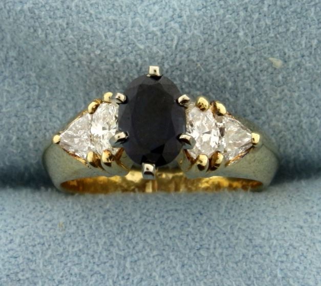In 14k yellow gold. Contains an oval 1ct high quality natural sapphire with deep saturated blue color and excellent clarity. Also contains two .1ct high quality marquise diamond, and two trillion cut .2ct high quality diamonds, VS clarity/F color. Size 5 1/2. 5.0g.