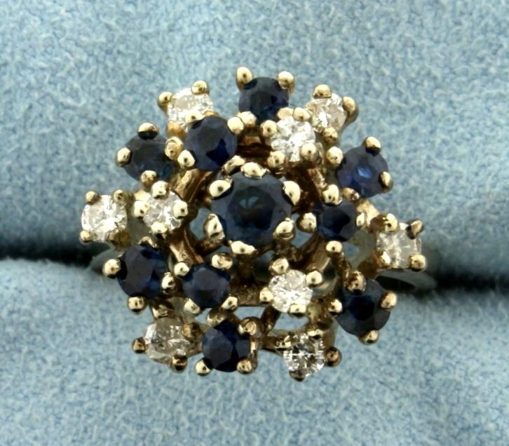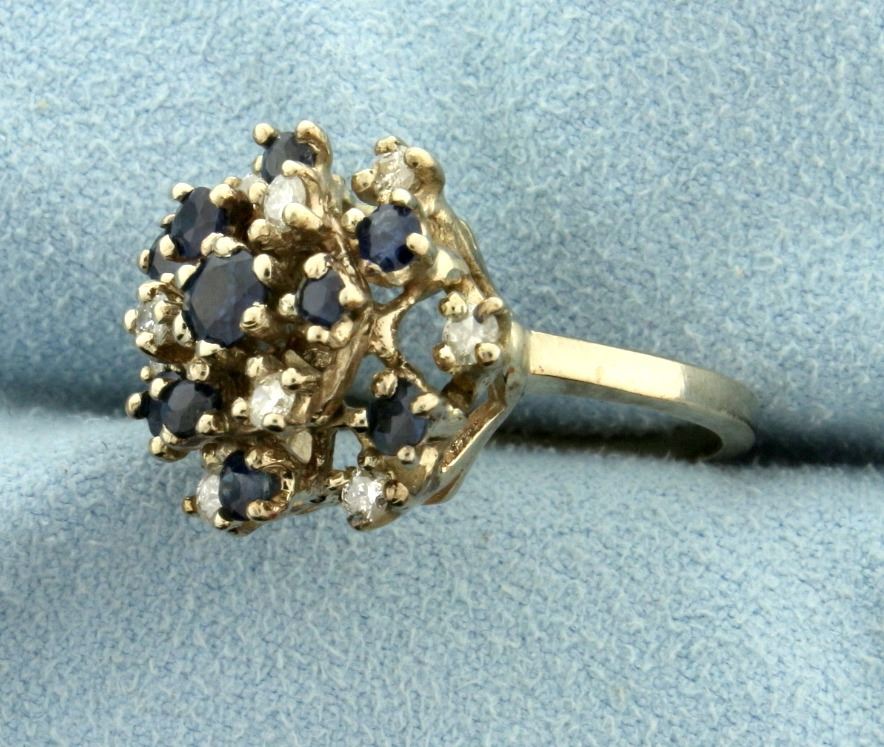 In 14k white gold, containing a center sapphire that is 3mm surrounded by nine 2.5mm sapphires. All with intense blue color. Also contains 1/3ct TW of high quality diamonds SI clarity/G color. Size 6 1/2. 6.2g.