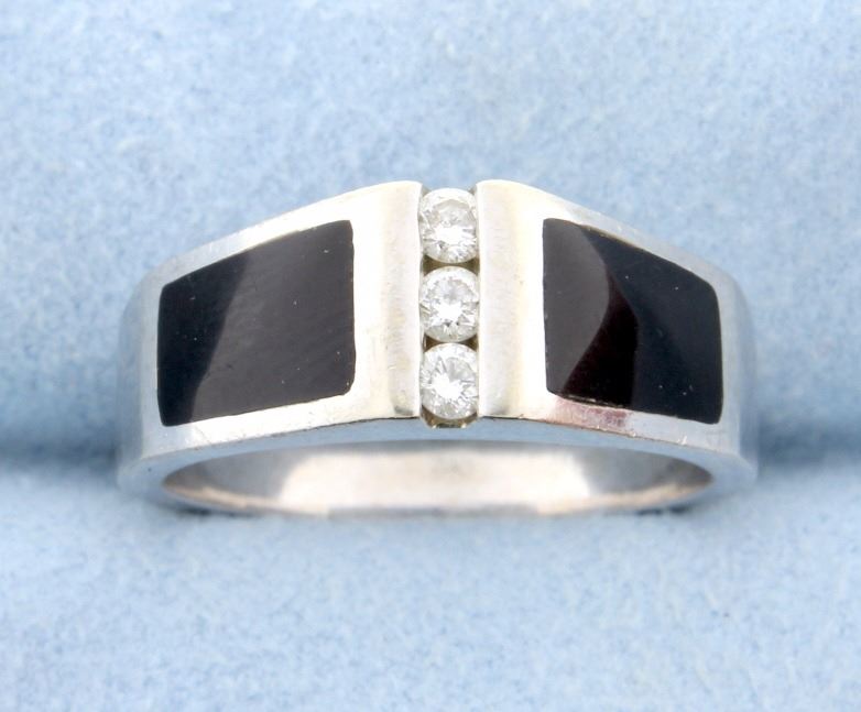 Really beautiful and somewhat unique diamond 14k white gold wedding band. There are three gem brilliant cut diamonds at the center of the onyx inlay for a total diamond weight of 0.10 carats, SI clarity and G-H color. 6.6g Size 7