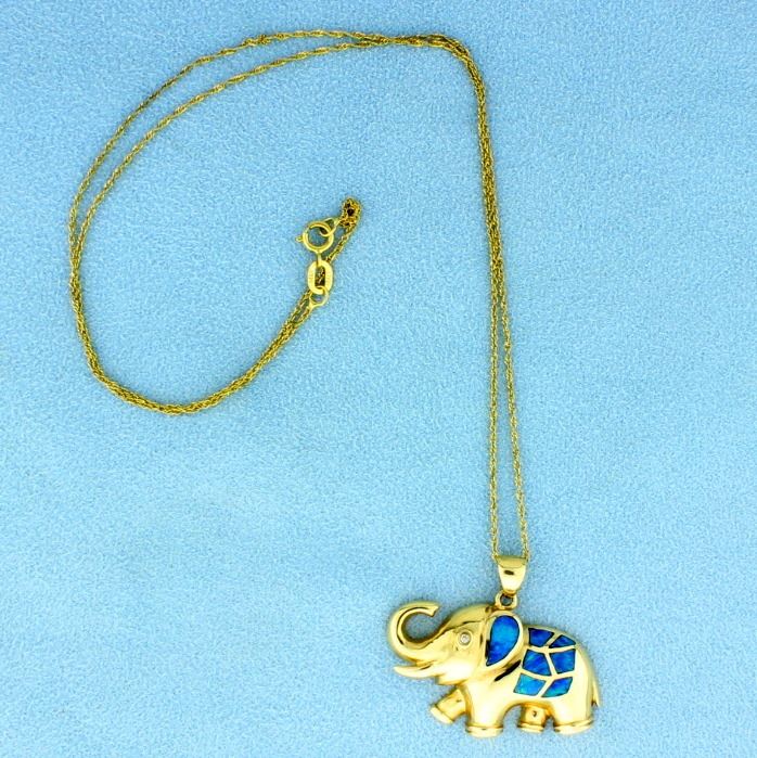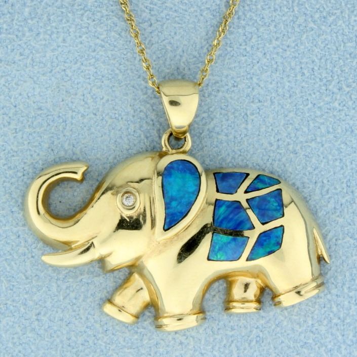 In 14K yellow gold, the pendant is 1 inch long with the bale, and contains a .01ct diamond for an eye, as well as about 2cts of opal gemstones in its body.         5.8g