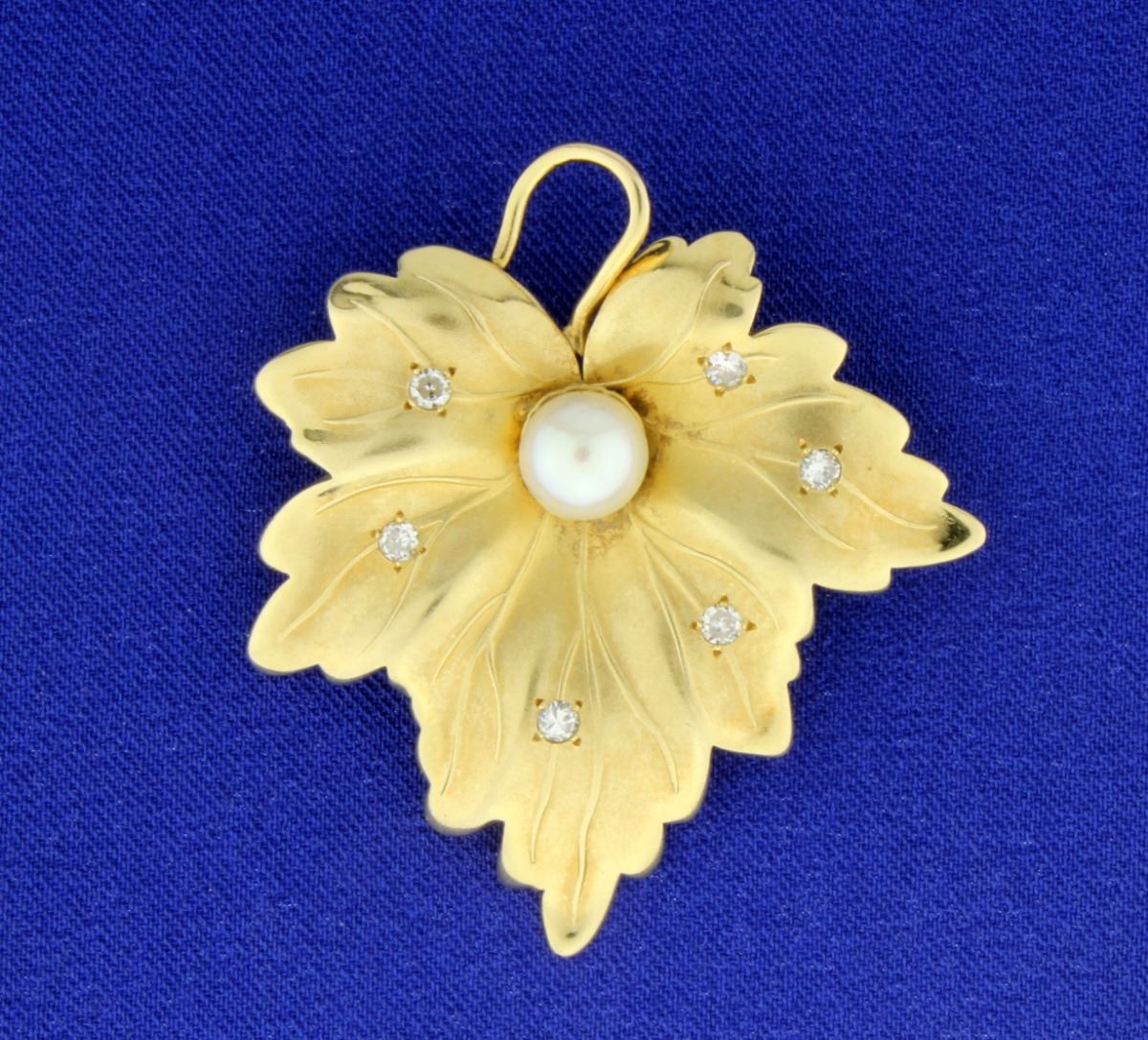 In 14K yellow gold, the leaf shaped pendant/pin has a 7.5mm pearl with great luster, it also has six high quality .05ct round diamonds G color/SI clarity. Can be worn as pendant or pin. 14.0g