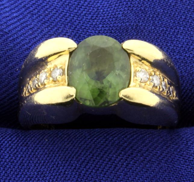 14k Yellow Gold. Peridot 10mmx8mm, approximately 3 carats. 4 Diamonds .12 carat total weight (H color, SI clarity). Size 7.5. 9.6g