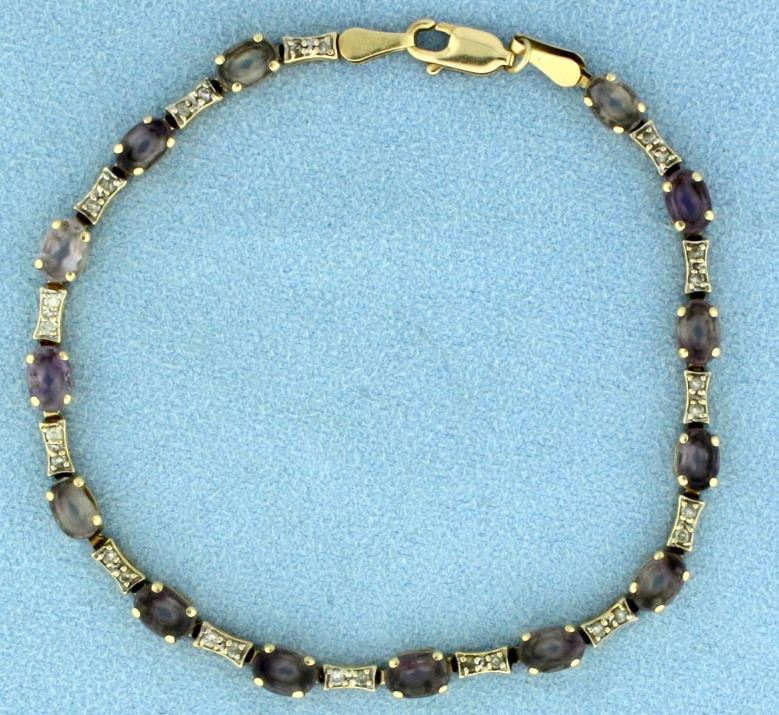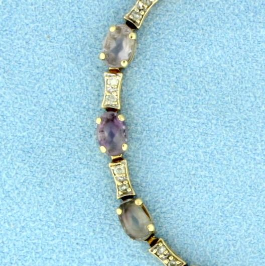 In 14k yellow gold, containing 1/4ct TW of diamonds and 7cts of oval shaped quartz gemstones. Quartz gemstones range in color from purple to smoky color to translucent. 7 5/8 inches long. 5.9g.