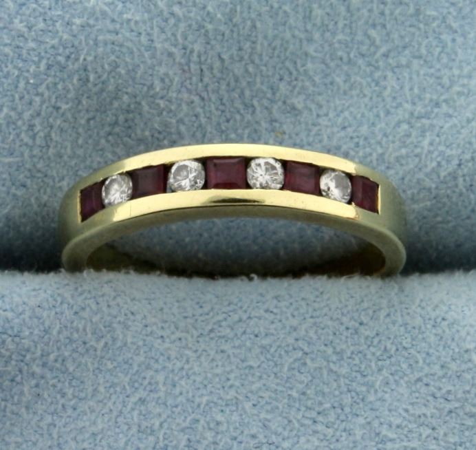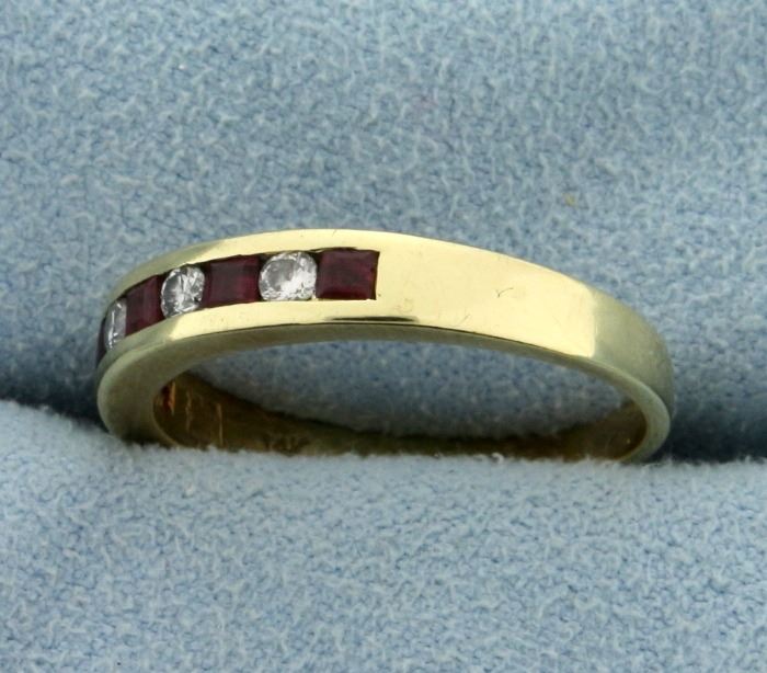 In 14k yellow gold, containing four .05ct high quality diamonds SI clarity/H color. Also contains five 2.5mm square natural rubies with excellent color and clarity. Size 7 1/4. 3.5g.