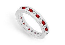 Creating a fine contrast of vibrant red and soothing white this vivacious eternity band is channel-set with alternating round rubies and brilliant-cut diamonds. Made in 18K white gold this eternity band has a total gem weight (TGW) of 1.00 ct. A perfect gift for any July born as Ruby is Julys birthstone