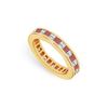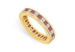Creating a fine contrast of vibrant red and soothing white this vivacious eternity band is channel-set with alternating square rubies and princess-cut diamonds. Made in 18K yellow gold this eternity band has a total gem weight (TGW) of 2.00 carat. A perfect gift for any July born as Ruby is Julys birthstone.