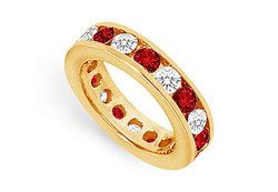 Creating a fine contrast of vibrant red and soothing white this vivacious eternity band is channel-set with alternating round rubies and brilliant-cut diamonds. Made in 18K yellow gold this eternity band has a total gem weight (TGW) of 3.00 ct. A perfect gift for any July born as Ruby is Julys birthstone