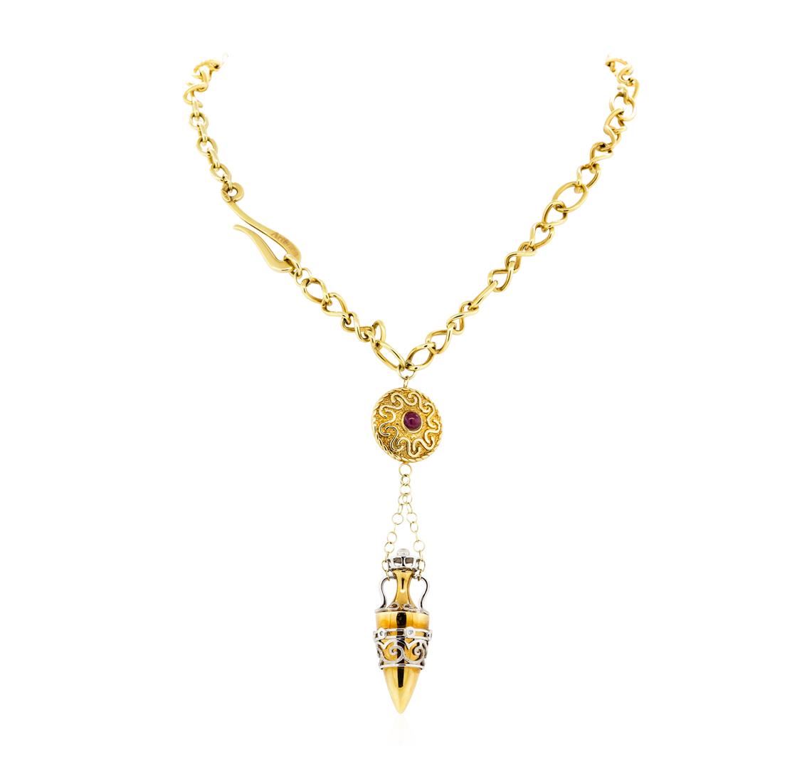 One eighteen inch necklace with a four inch drop featuring: 14KT yellow gold weighing 23.0 grams containing rubies weighing 0.30ctw and diamonds weighing 0.08ctw.