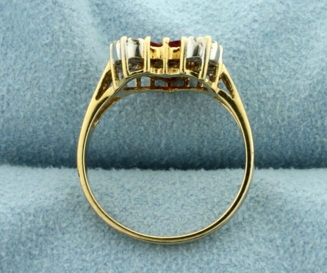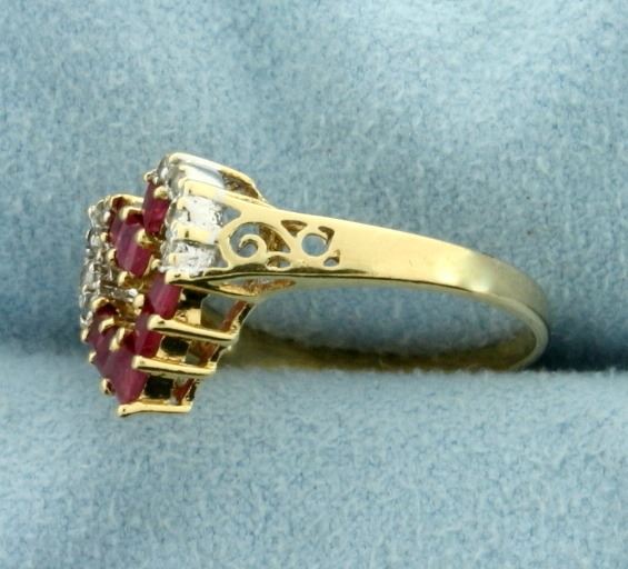 In 14k yellow gold. Contains eight high quality natural 2mm square cut ruby gemstones with bright ruby red color and excellent clarity. Also contains eight high quality .01ct diamonds, SI clarity/H color. Size 6 1/2. 2.7g.
