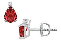 A pair of perfectly matched pear-shaped rubies is set in a rich 14K white gold prong mounting. A round diamond is set on the top. These gemstone stud earrings have a total weight (TGW) of 2.04 ct and are available in either screw-back or push-back. Available in yellow gold also.