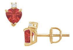 A pair of perfectly matched heart-shaped rubies is set in a rich 14K yellow gold prong mounting. A round diamond is set on the top. These gemstone stud earrings have a total weight (TGW) of 2.04 ct and are available in either screw-back or push-back.