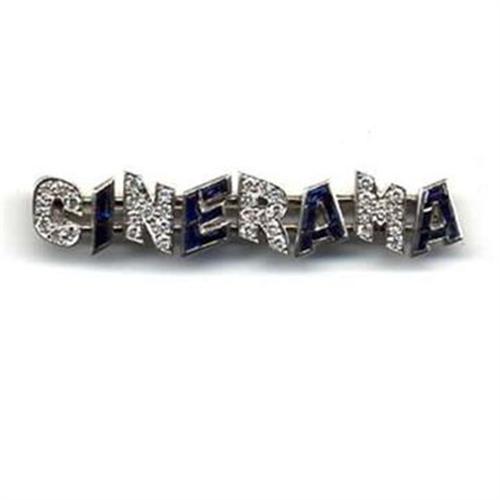 A whimsical Art Deco style sapphire and diamond bar pin spelling the word "Cinerama".The Platinum and white gold brooch is made up of approximatly .75cts of full-cut round diamonds and 1.00ct of calibre cut sapphires. For the ultimate "Drama Queen".
