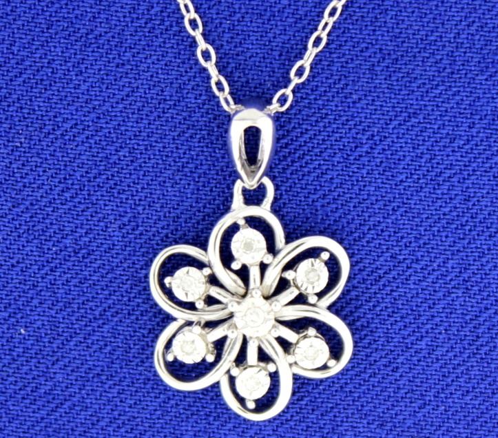 Sparkling genuine diamond flower pendant hangs off of a 18 inch sterling silver chain. The sterling silver flower contains .04 ct of diamonds. 2.3 g