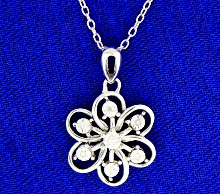 In sterling silver. Sparkling genuine diamond flower pendant hangs off of a 18 inch sterling silver chain. The sterling silver flower contains .04 ct of high quality diamonds. 2.3 g
