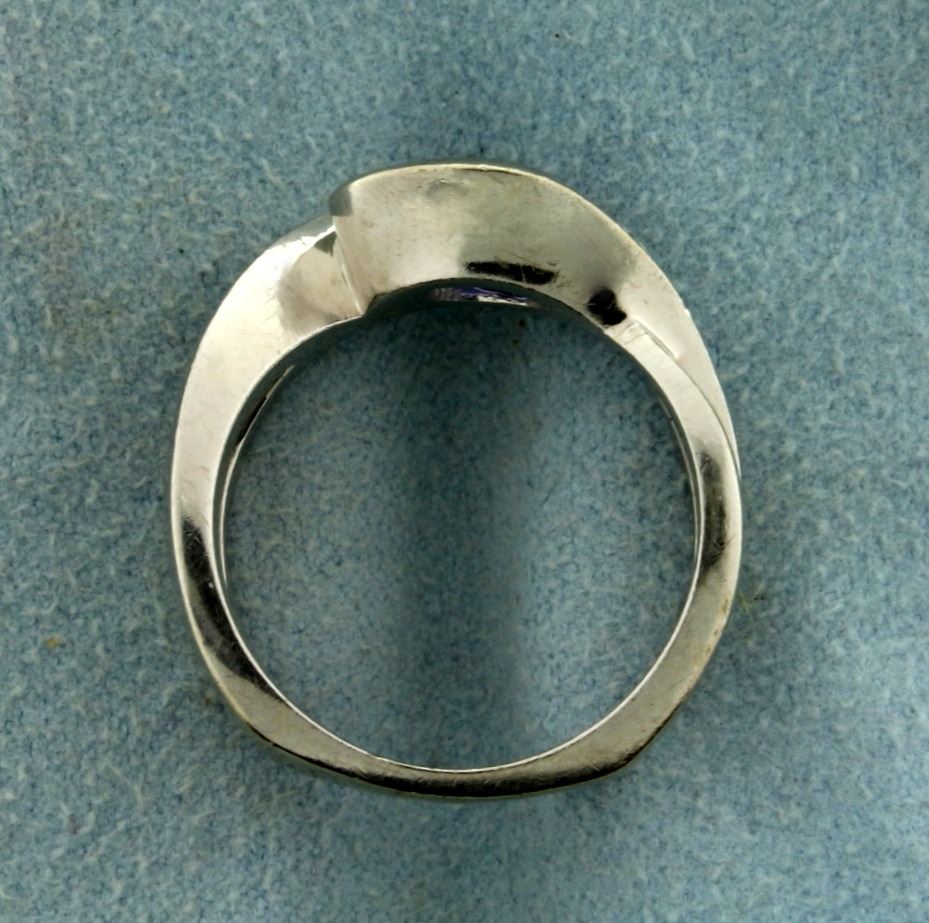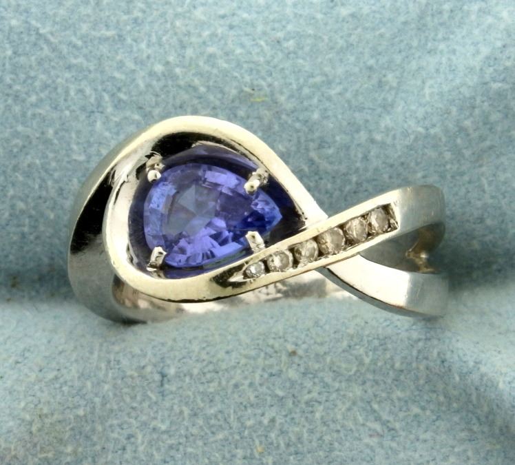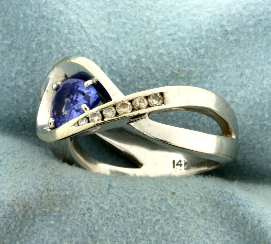 In 14k white gold. Contains a high quality pear shaped 1ct natural Tanzanite gemstone with excellent clarity and bright purple blue color. Also contains six high quality diamonds ranging in size from .02 to .005 cts. Diamonds are SI clarity/H color. 8.7g.