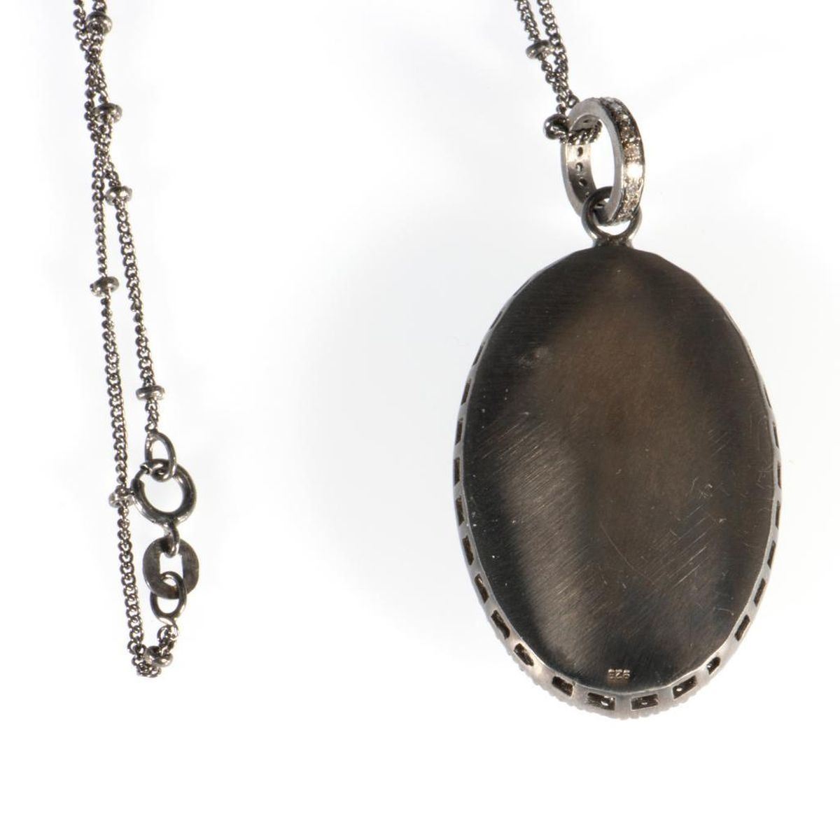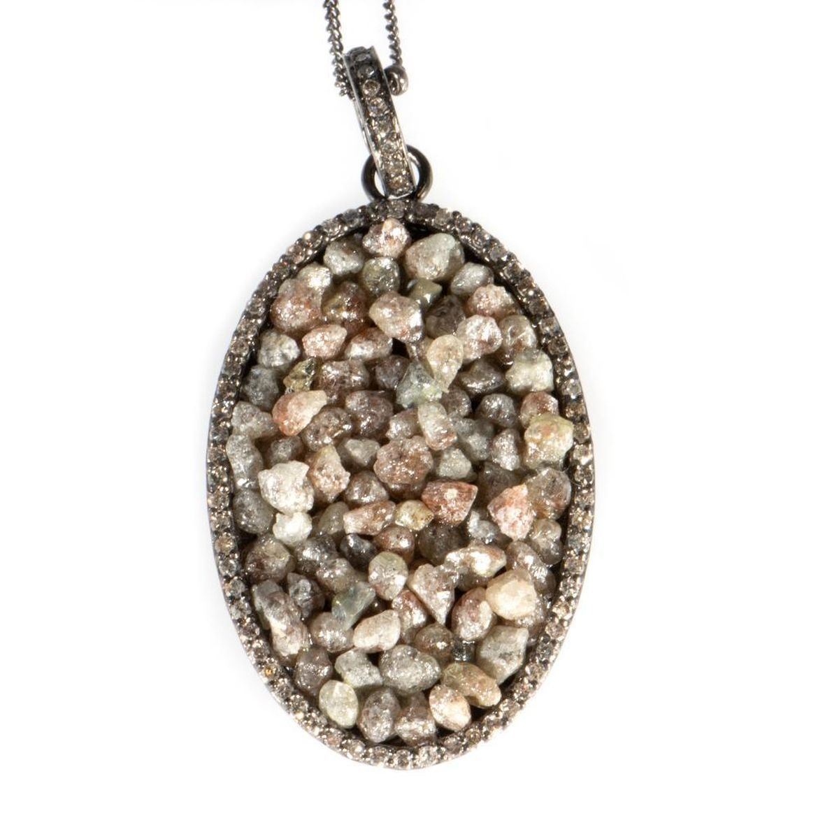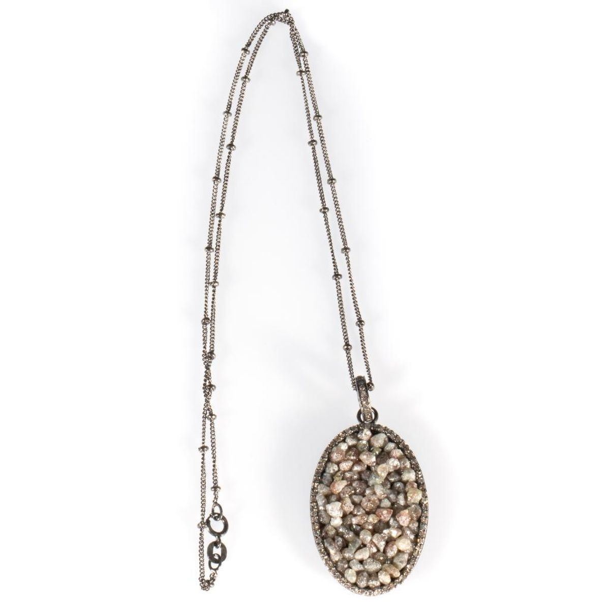the oval pendant featured a tumble of rough diamonds, within a frame of single-cut diamonds; length: 17in; pendant length: 1 3/4in.