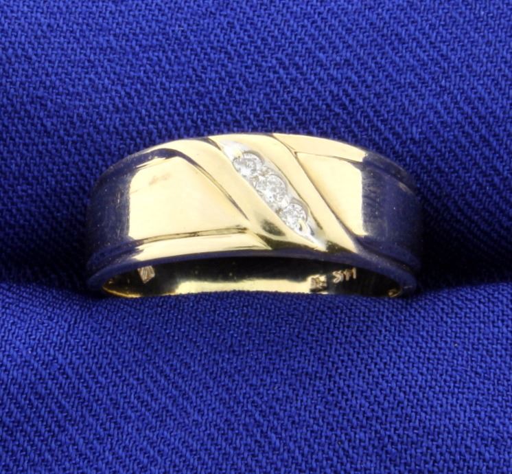 Diamond band with three brilliant cut diamonds weighing 0.10 cts. The top of the ring is 7.4mm wide and tapers to the back to 4.5mm. The brill cut diamonds are SI clarity and "H-I" in color. Size 7 1/2. 3.9gr.