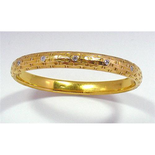 Elegantly designed gold bangle bracelet. Five bezel-set faceted diamonds ornament the narrow basket-weave design bangle, creating a beautiful artistic effect. Marked 14Kt and the maker's mark of Sloan & Company New York on inside.