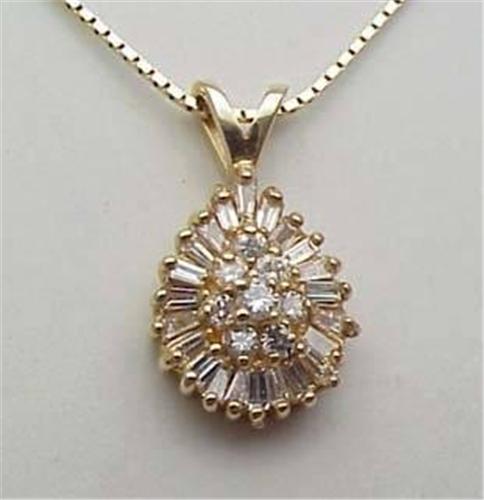 Diamond cluster pendant 1Ctw round and baguette diamonds 14kt yellow gold 18" 4.1gr