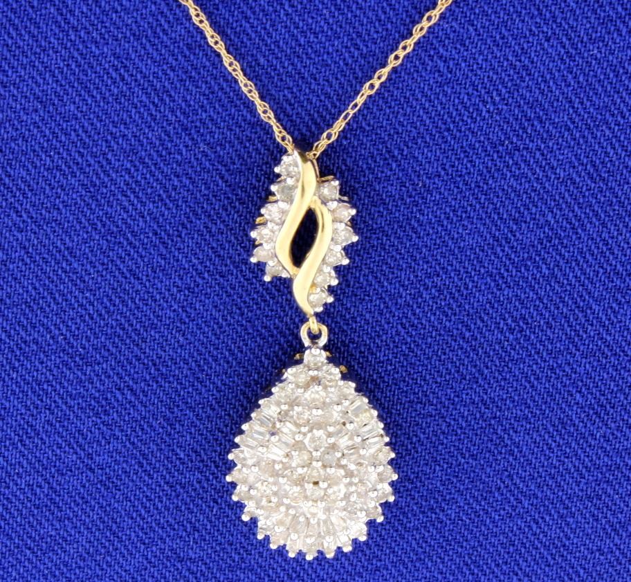 This gorgeous 10k yellow gold drop style pendant is covered in sparkling diamonds! There are a total of 69 round brilliant cut diamonds and tapered baguettes, clarity SI2-I1 and H-I-J color. The chain is also 10k yellow gold and measures 18" long. 3.0g