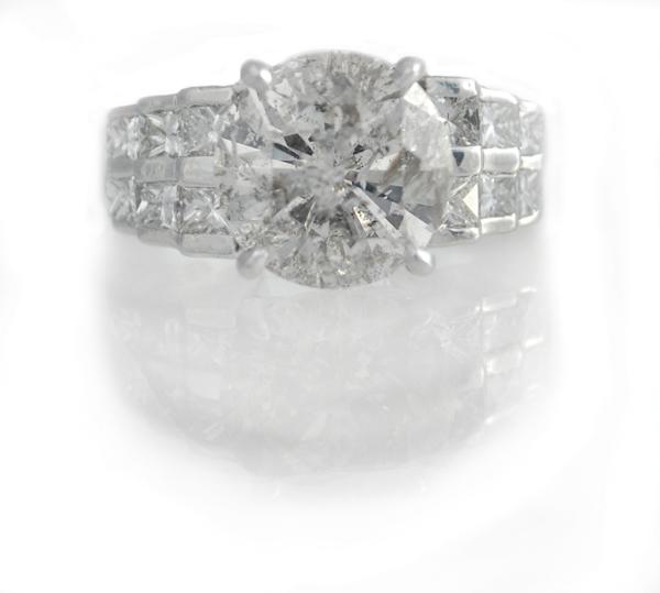 Diamond ring; mounted in platinum, center set with (1) round cut diamond weighing 5.01 cts, side set with a total of (12) princess cut diamonds weighing 1.20 cts. Total ring weight 15.0 grams. Ring size 7.5