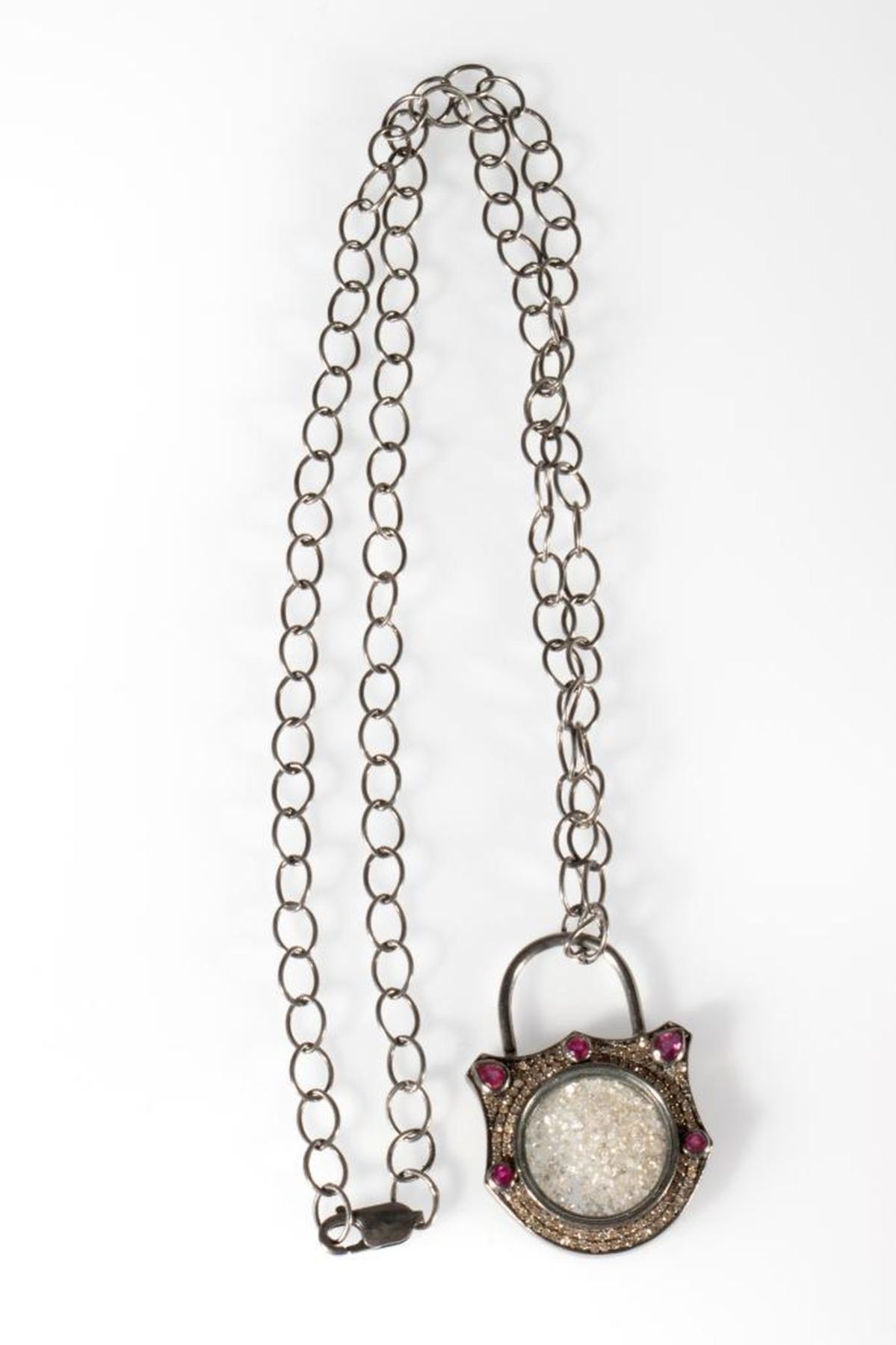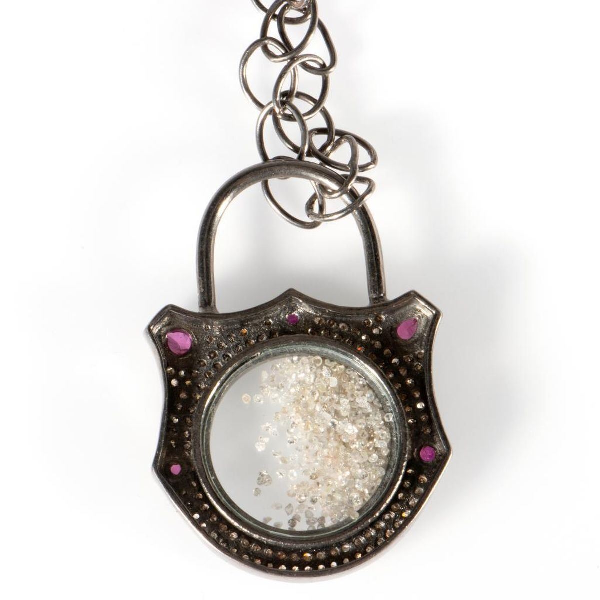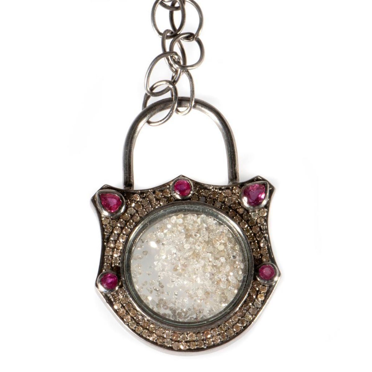 designed as a lock, the shaker pendant encloses round-cut diamonds, pave-set with single-cut diamonds, and highlighted with 5 bezel-set pear and round-cut rubies, suspended from an open link silver chain; approximate diamond weight: 2.10cts; length: 24in.; pendant length: 1 5/8in.
