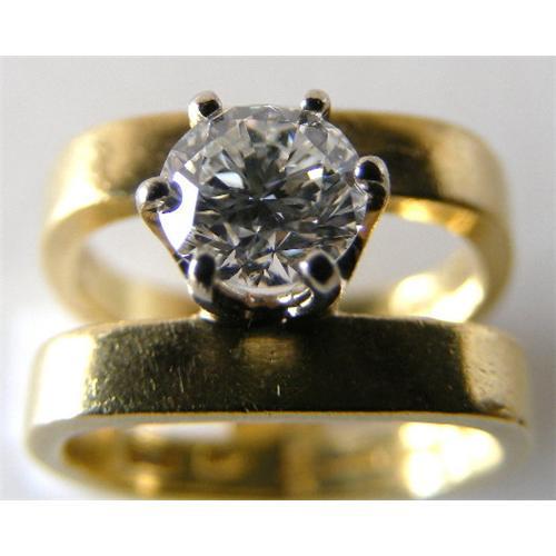 More pics available. One 18k yellow gold ring mounted with one round brilliant cut diamond measuring 6.7mm 3.58mm, weighing approximately .98 carats, with a color grade of G-H and a clarity grade of VS1. The ring is an approximate size 5.The total weight is approximately 9.5 grammes.The shank is squared in design. This ring comes with an appraisal of $5,850 from Axtell Custom Jewelers who are Graduate gemologist.Diamond and 18k
