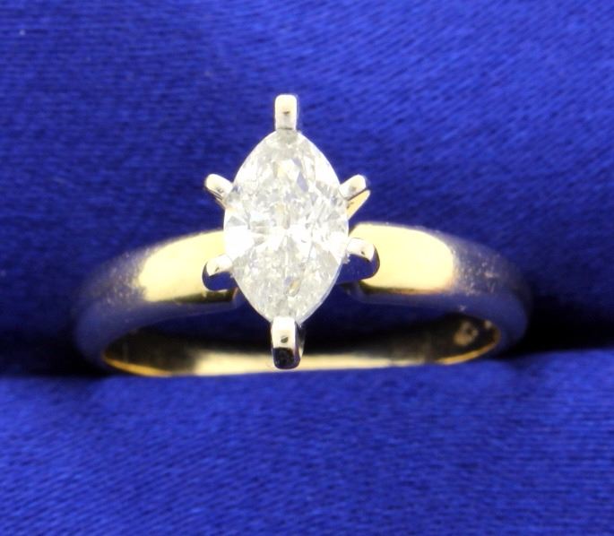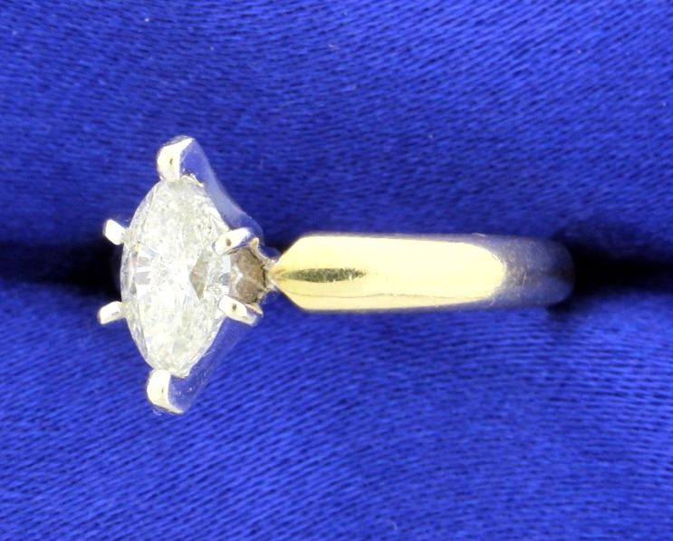 Beautiful 0.75 carat diamond marquise solitaire ring set in 14k yellow gold with 6 prong white gold head. The marquise is I2 clarity and color H. The band is 3.3mm wide and the ring is size 5 3/4. 3.1g