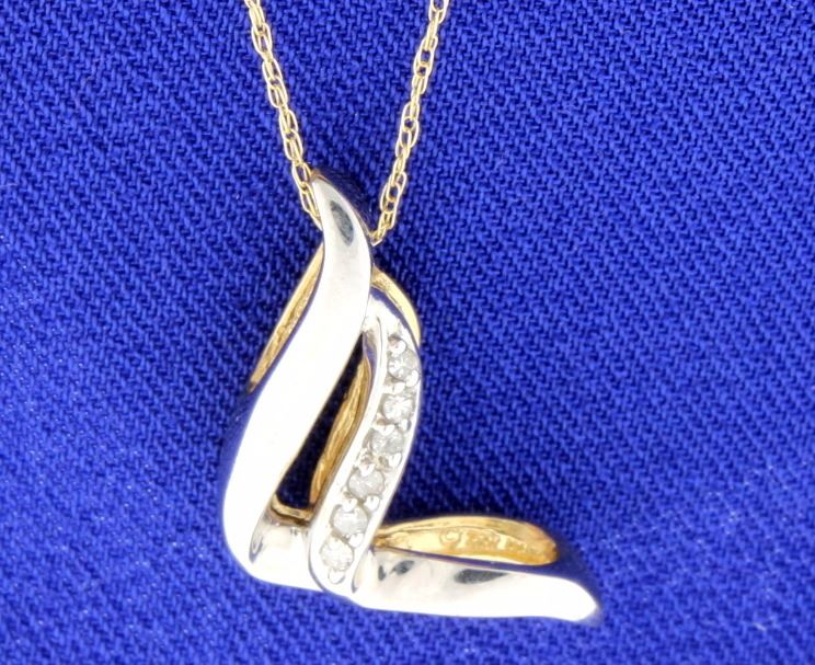 Lovely 10k tutone pendant with 6 diamonds, approx. 1/10 carat, and accented with a 10k yellow gold chain. 2.4g