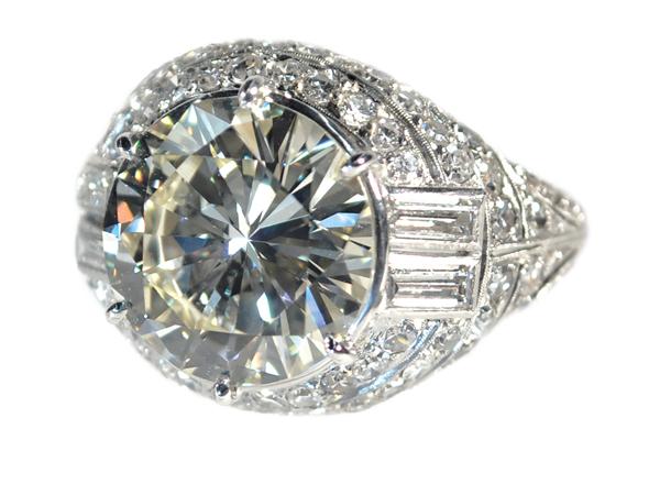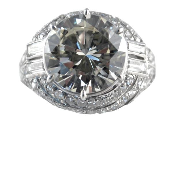 Diamond ring; of 18k white gold, center set with (1) round diamond weighing 7.08 cts, accented by round and baguette cut diamonds weighing 3.00 cts. Total ring weight 8.8 grams. Ring size 7.5