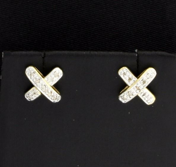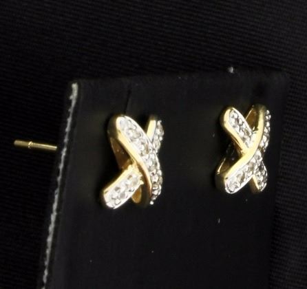 In 14K yellow gold the "x's" is 3/8 inch long and contains eighteen .01ct diamonds, comes with friction backs. 2.0g