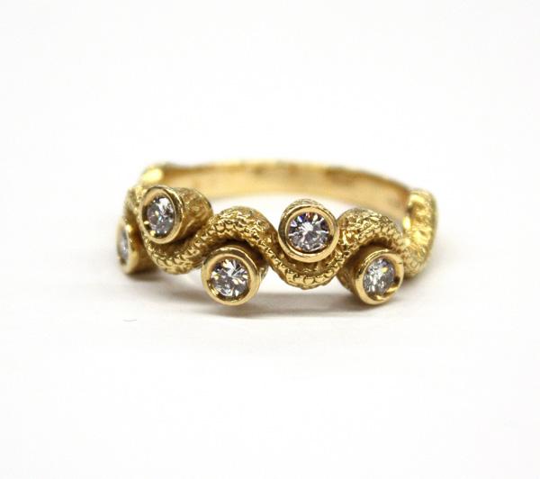 Diamond ring; mounted in 18k yellow gold, set with (5) bezel set diamonds weighing 0.40 ct. Total ring weight 7.7 grams. Ring size 8