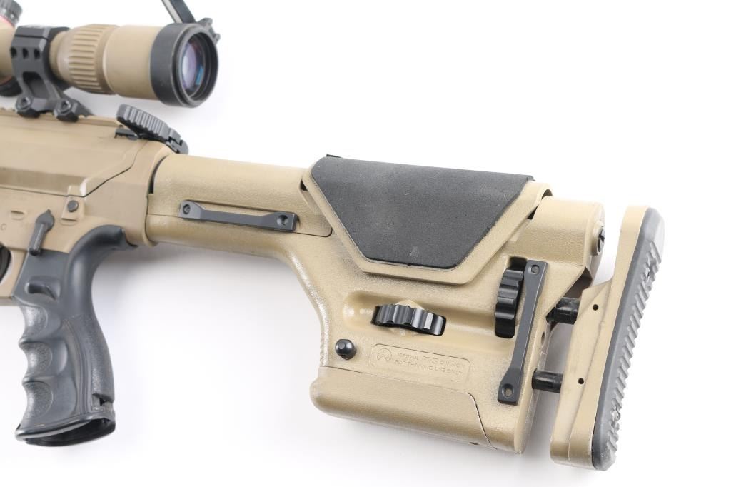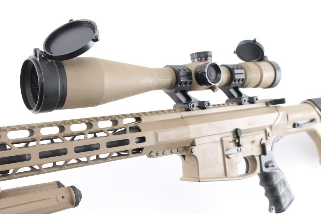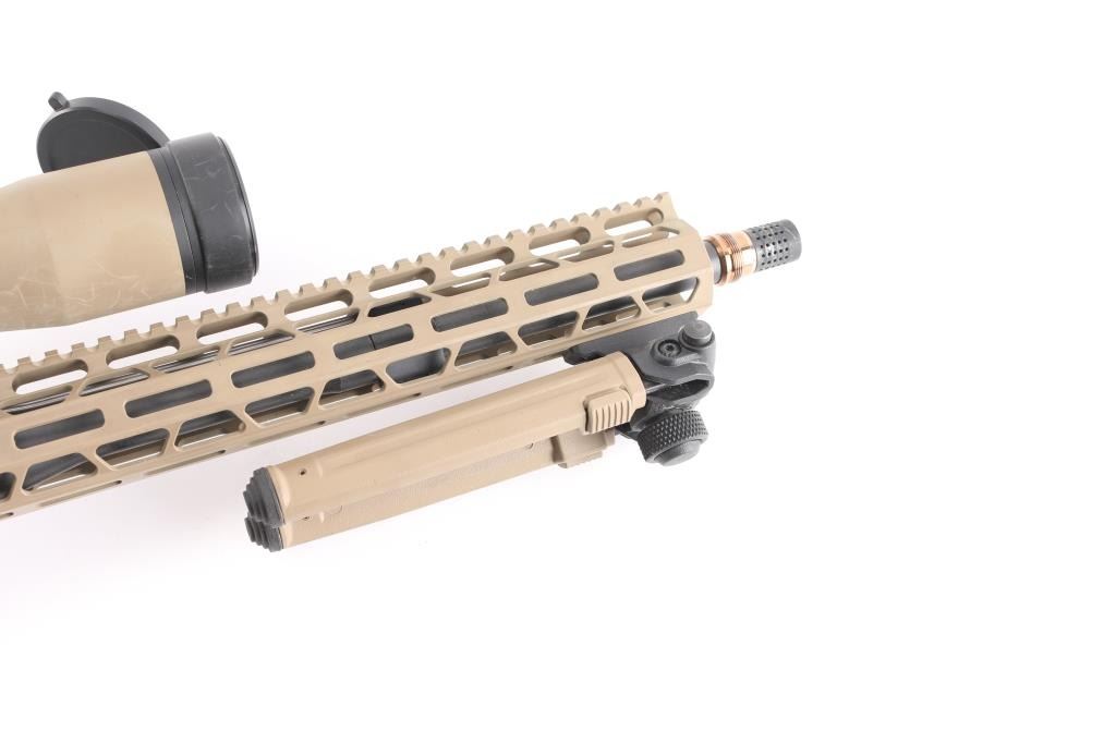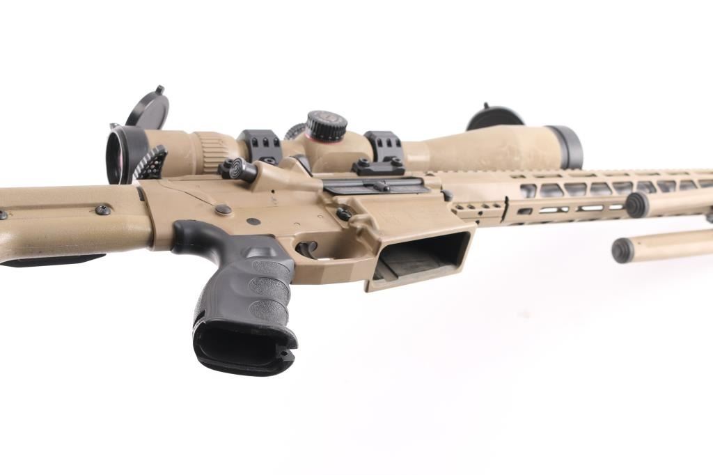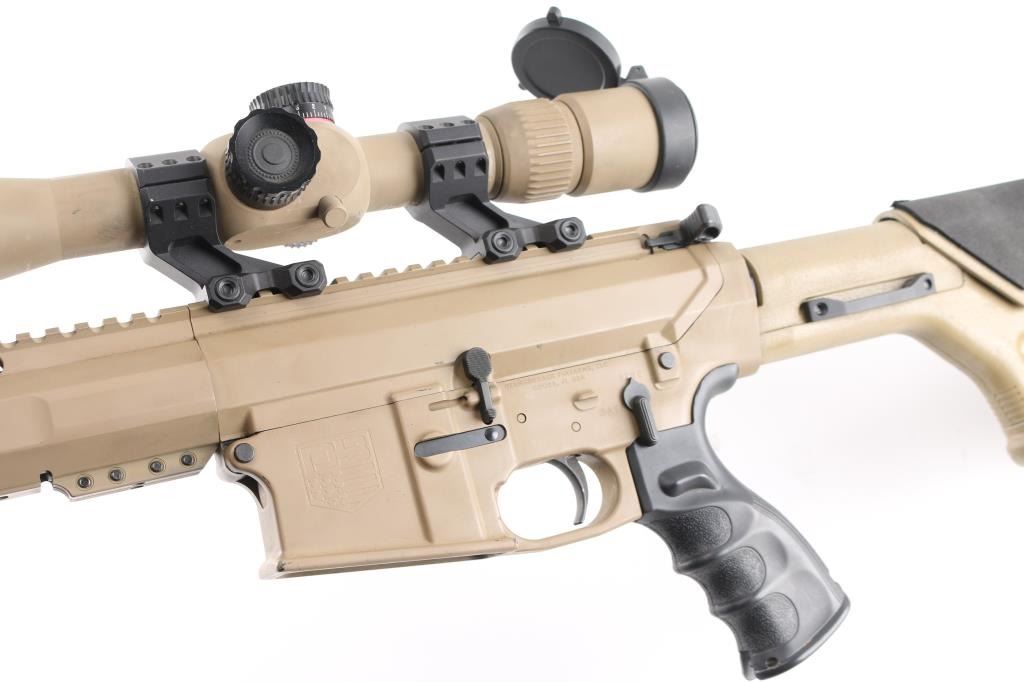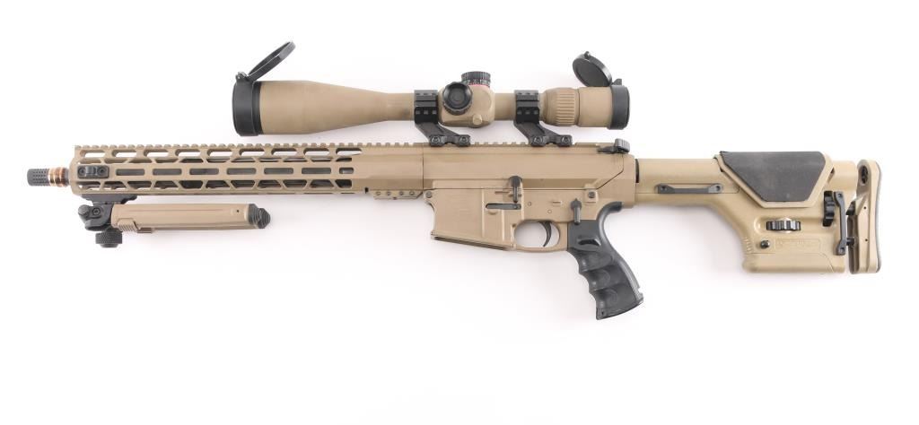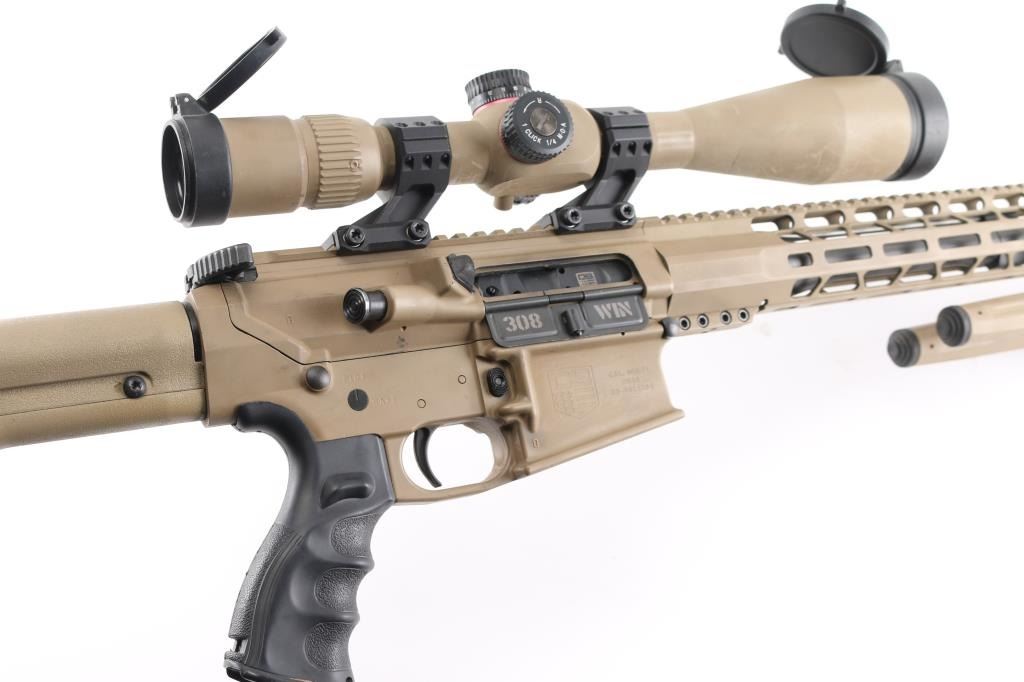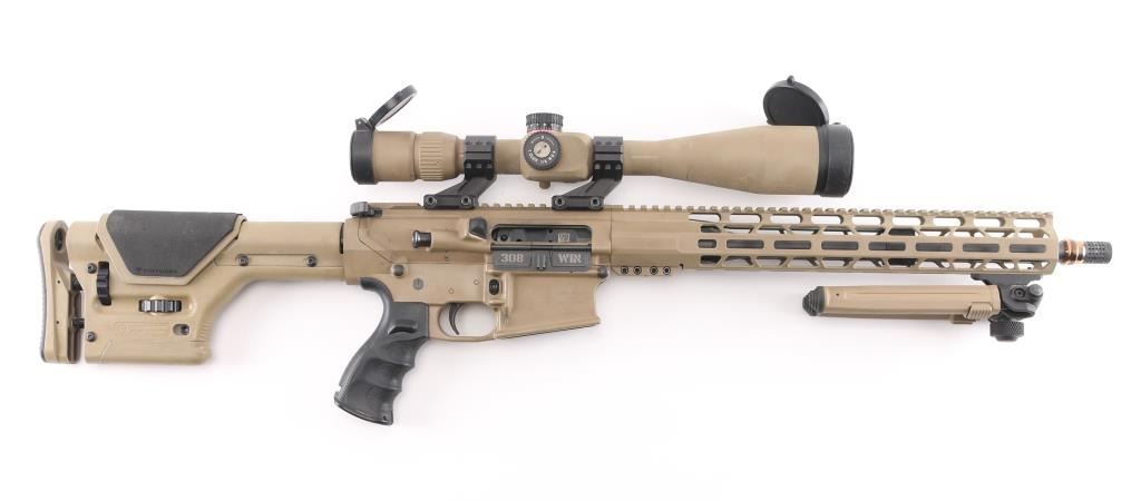 Direct impingement AR-10 platform semi-automatic modern sporting rifle chambered in .308 Winchester. Flat dark earth finish with matte black controls. Features a black nitride 16" barrel with 1-10 twist, Cherry Bomb muzzle break, mid-length gas system, cerakoted 15" M-LOK handguard & 7075-T6 forged aluminum receiver set with flat-top upper, forward assist, shell deflector, dust cover with caliber marking, Melonite coated bolt carrier, single stage trigger, thumb safety on the left side of the receiver, GI style charging handle, textured, finger grooved black synthetic pistol grip and Magpul PRS shoulder stock with adjustable rubber padded cheek rest and recoil pad. Adjustable bipod installed, mounted with a Monstrum G2 6-24x50 tactical scope with lens covers, clear optics. Both the scope and bipod match the finish of the rifle. No magazine. Bore is excellent/bright, action is smooth, finish is overall excellent with some minor scratches, scuffs.