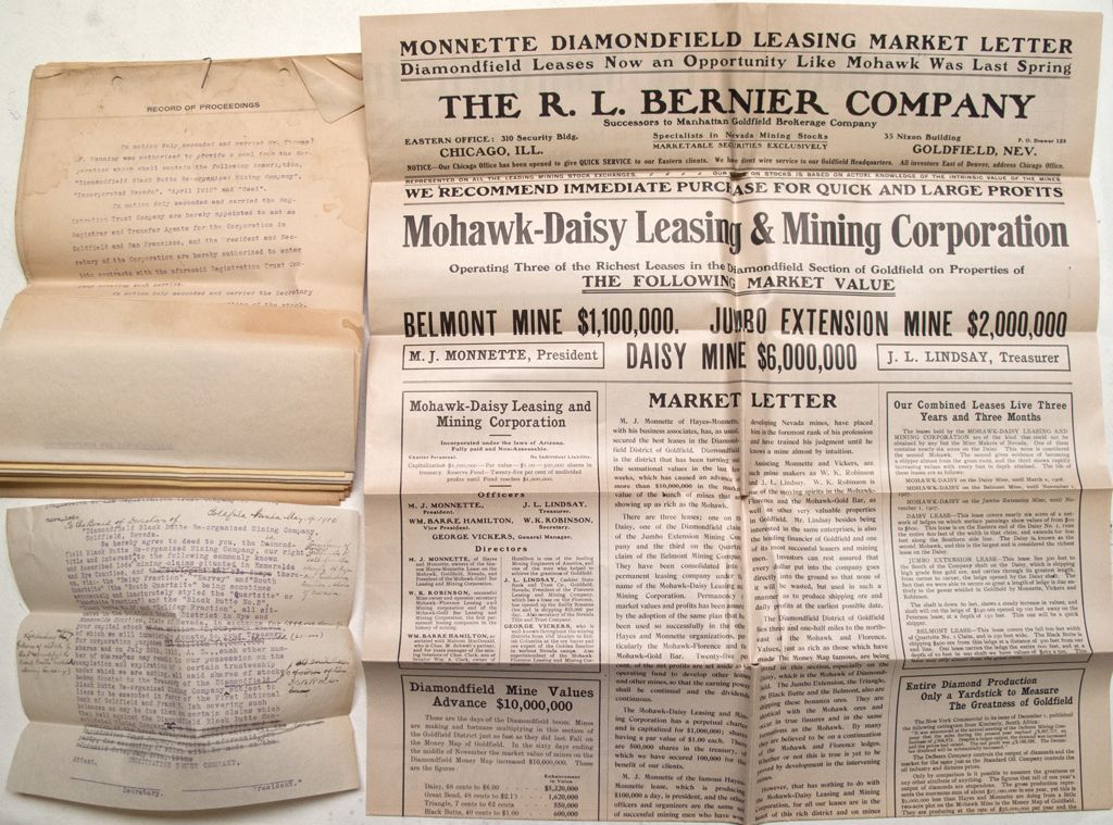 1) R. L. Bernier Company of Goldfield newsletter. 2) Diamondfield and Goldfield good news. Ripped at fold. 3) Copy of the Diamondfield Black Butte Reorganized Mining Company, 1910. 16 pages of information on the establishment of the company.