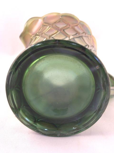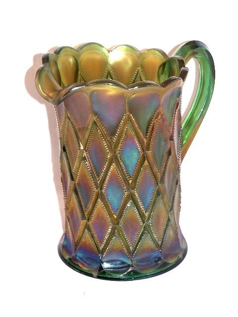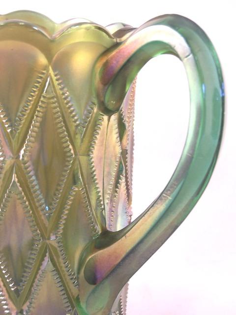 Diamonds 7" Green Pitcher by Millersburg. Scarce color to find this outstanding pitcher. Condition and color are good, although pitchers base is slightly uneven from the firing process. Ca 1920's