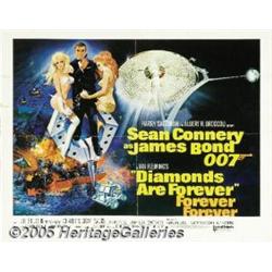 <B>Diamonds Are Forever (United Artists, 1971)</B></I> Half Sheet (22" X 28"). The last official outing of Sean Connery in his most famous role of "Bond...James Bond." Diamonds are disappearing from mines, couriers and smugglers all around the world. The British Secret Service wants to know why, and so of course they send 007. The trail leads through diamond smuggler Tiffany Case (Jill St. John) to reclusive millionaire Willard Whyte (Jimmy Dean) and on to Bond's arch nemesis, Ernst Blofeld (Charles Gray). Blofeld plans to use all the accumulated diamonds to build a super satellite capable of destroying any target on earth! "The satellite is now over...Kansas. Well, if we destroy Kansas the world may not hear about it for years." This gorgeous half sheet has artwork of Bond and two of his women dripping in diamonds. It also shows the satellite and the battle for Blofeld's oil platform headquarters. Pinholes, some edge wear, several edge tears with two taped on the back, and some wrinkling around the folds. Fine/Very Fine.