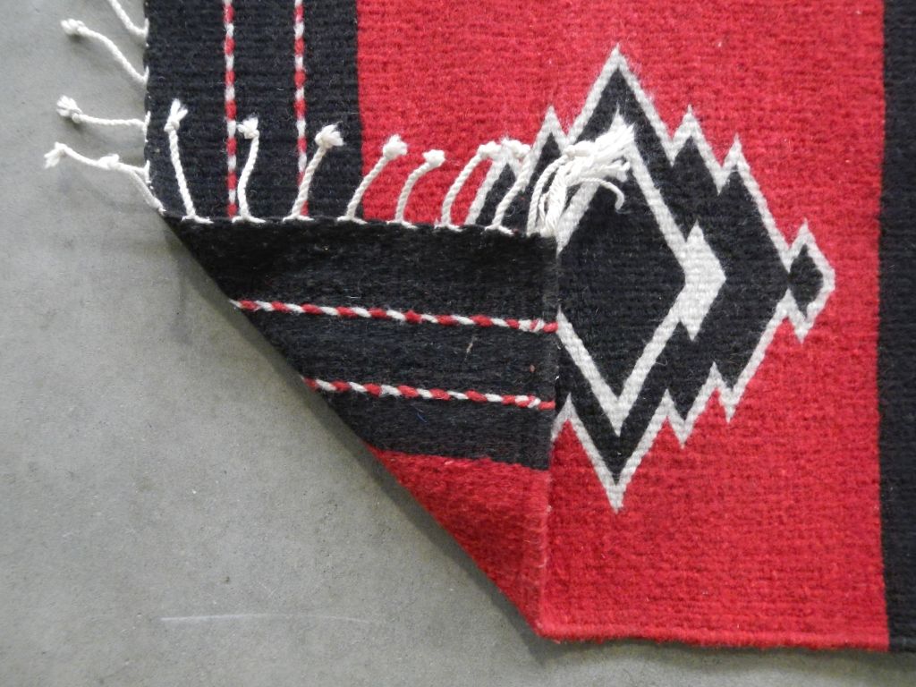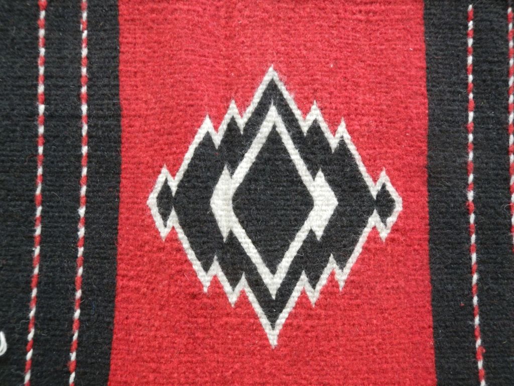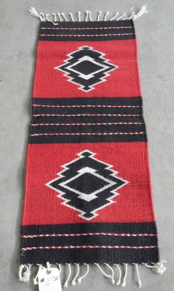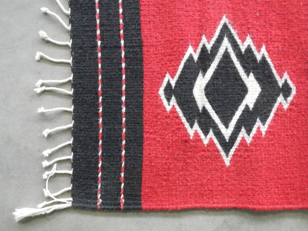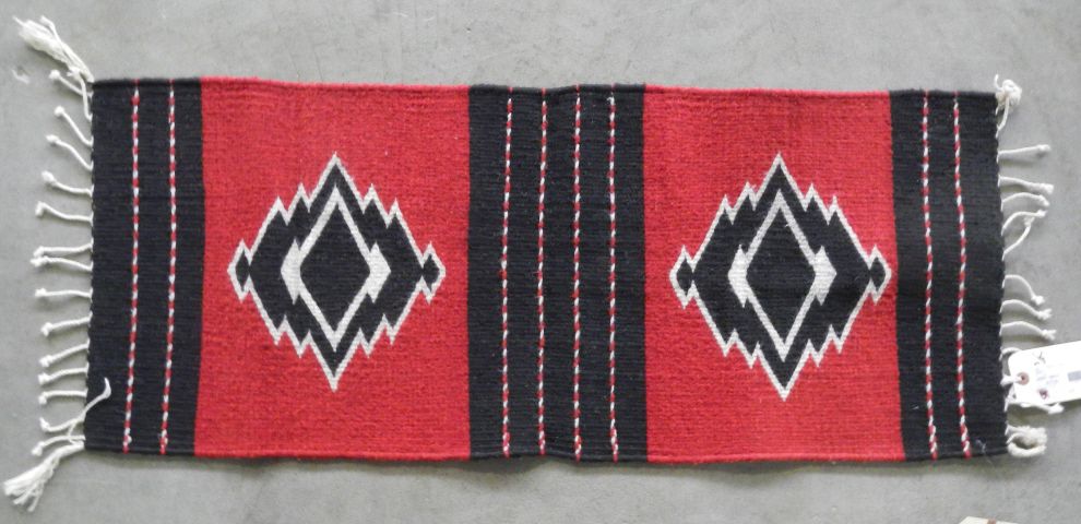 "Diamonte Rojo" Zapotec Table Runner This rug has a Diamonte Rejo Pattern (Diamonds Red) and is made of Hand 100% Churro Wool and Color Fast Dye and Aniline Dye. Thsi is a Navajo Style Rug weaved by Luis Hernandez. Made in Oaxaca, Mexico. The Zapotec are significant because 400 years ago the Spanish missionaries taught the Navajo and Zapotec how to weave, these practices are still mastered today in both Zapatec and Navajo Tribes. Size is 16"x3'3"