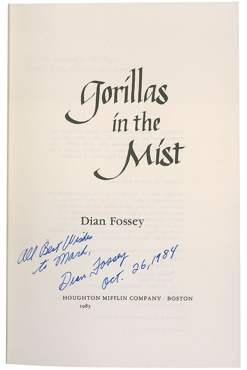 American ethologist (1932–1985) who earned worldwide renown for her intimate studies of gorillas in the mountain forests of Rwanda. She was murdered under still-uncertain circumstances likely related to her uneasy relationship with Rwandan locals who saw her as a threat to the gorilla-related tourist and exportation industry. Signed book: Gorillas in the Mist. First edition. Boston: Hougton Mifflin, 1983. Hardcover with dustjacket, 6.25 x 9.25, 1983 pages. Signed and inscribed on the title page, “All best wishes to Mark, Dian Fossey, Oct. 26, 1984.” Some light wear to boards, and scattered wear, creases, and edge tears to dustjacket, otherwise fine condition.