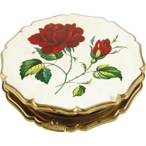 <B>Diana Dors Make-Up Compact.</B></I> A brass Stratton make-up compact with ceramic, rose-themed lid motif, owned and used by the British bombshell. In Excellent condition. <I> Accompanied by COA from L.A. Prop and Wardrobe Co.</B></I><BR><BR><b>Shipping:</b> Clothing, Costumes & Jerseys (<a target="_blank" href="http://www.heritageauctions.com/common/shipping.php">view shipping information</a>)