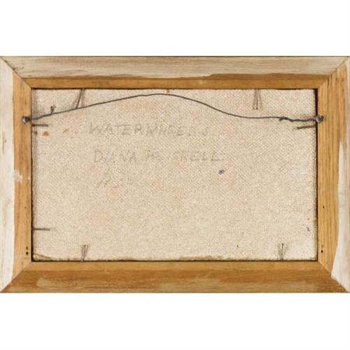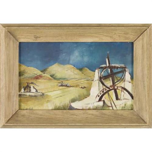 <B>DIANA HEISKELL (American, 20th Century)</B></I><BR><I>Waterwheels</B></I>, 1936<BR>Tempera on masonite<BR>6 x 10 inches (15.2 x 25.4 cm)<BR>Signed lower left:<I> Diana Heiskell</B></I><BR>Inscribed veros: <I>WATERWHEELS / DIANA HEISKELL/ 1936</B></I> <B>Condition Report:</B> Small surface scratches in the sky, framed, otherwise good condition.<BR><BR><b>Shipping:</b> Framed - without Glass, Small (<a target="_blank" href="http://www.heritageauctions.com/common/shipping.php">view shipping information</a>)