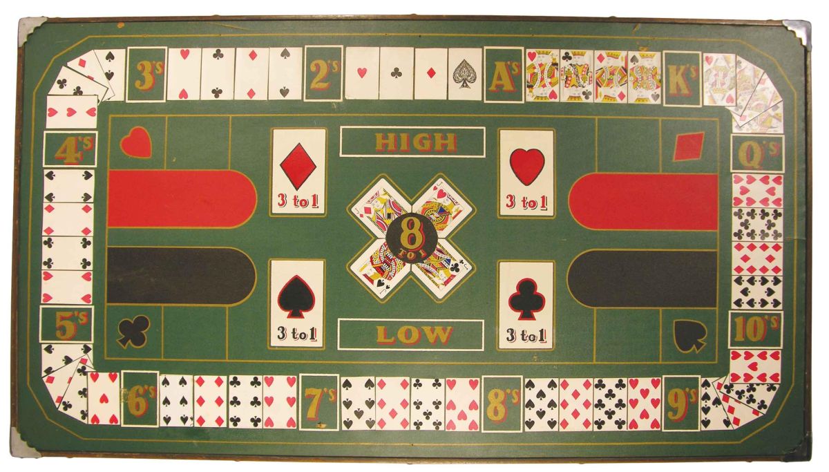 Diana Layout. Cards have been applied and the balance hand drawn. Diana was dealt from a double deck dealing box. Payoffs strongly favored the house, limiting its popularity and existence. This is one of the most attractive and sought after layouts amongst the collectors. Circa 1910-1920. Good condition. 44 1/2 X 24 1/2 inches.