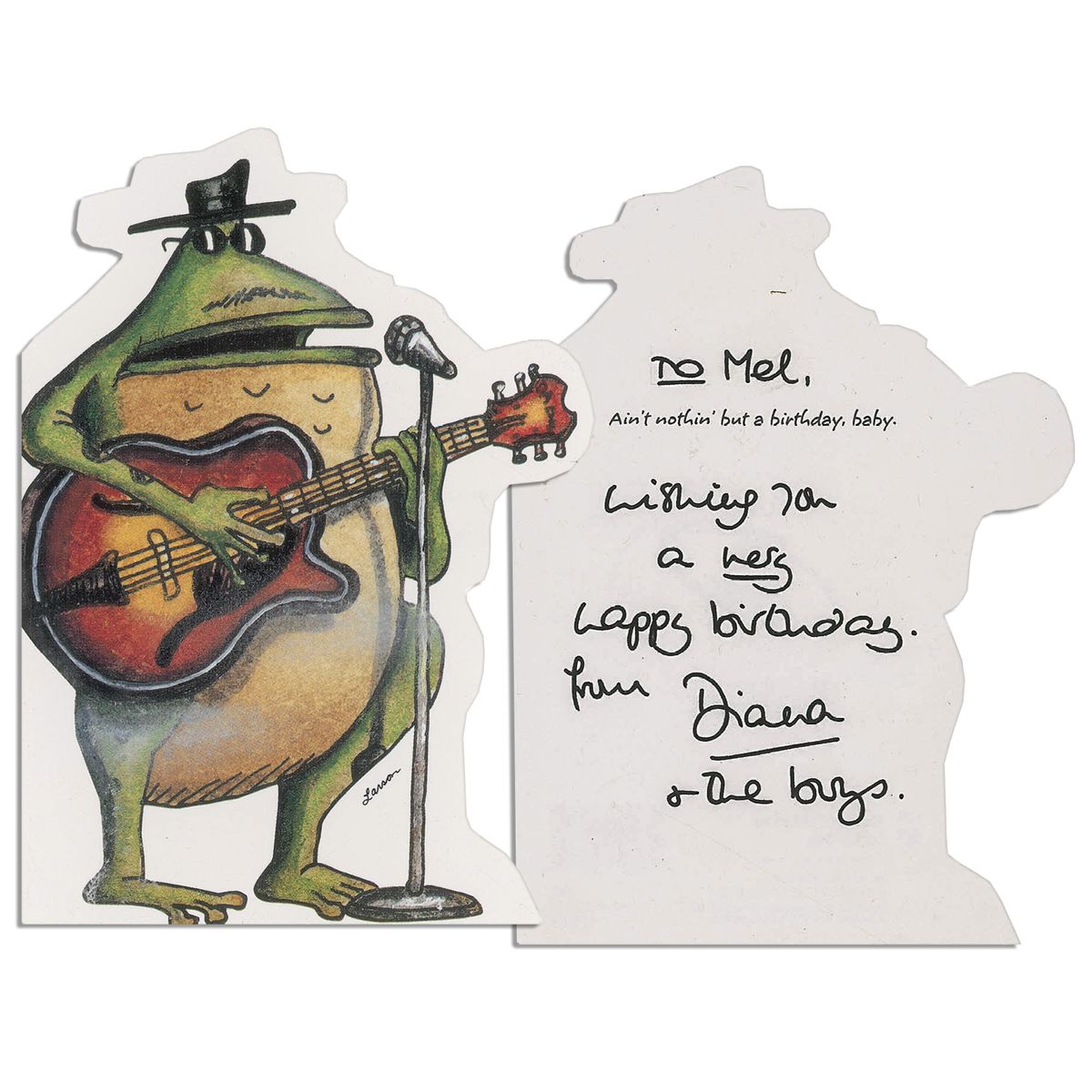 Birthday card bearing an autograph note signed by Diana Spencer as Princess of Wales. Card opens to a printed sentiment and handwritten note that reads, ''To Mel...Wishing you a very happy birthday. / from / Diana / & the boys.'' Illustrated card features a drawing of a frog with a guitar by Gary Larson. Measures 5'' x 7''. Accompanied by the original envelope hand-inscribed, ''To Mel,'' in Lady Di's hand. Near fine.