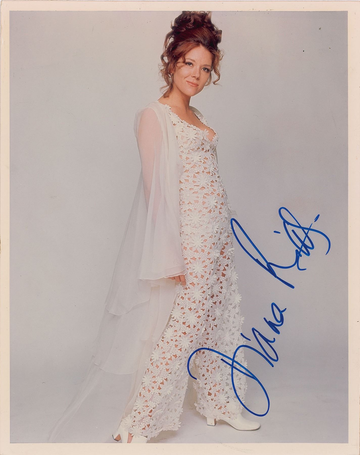 Color glossy 8 x 10 full-length photo of Rigg in a white floral outfit, signed in blue felt tip. In fine condition.