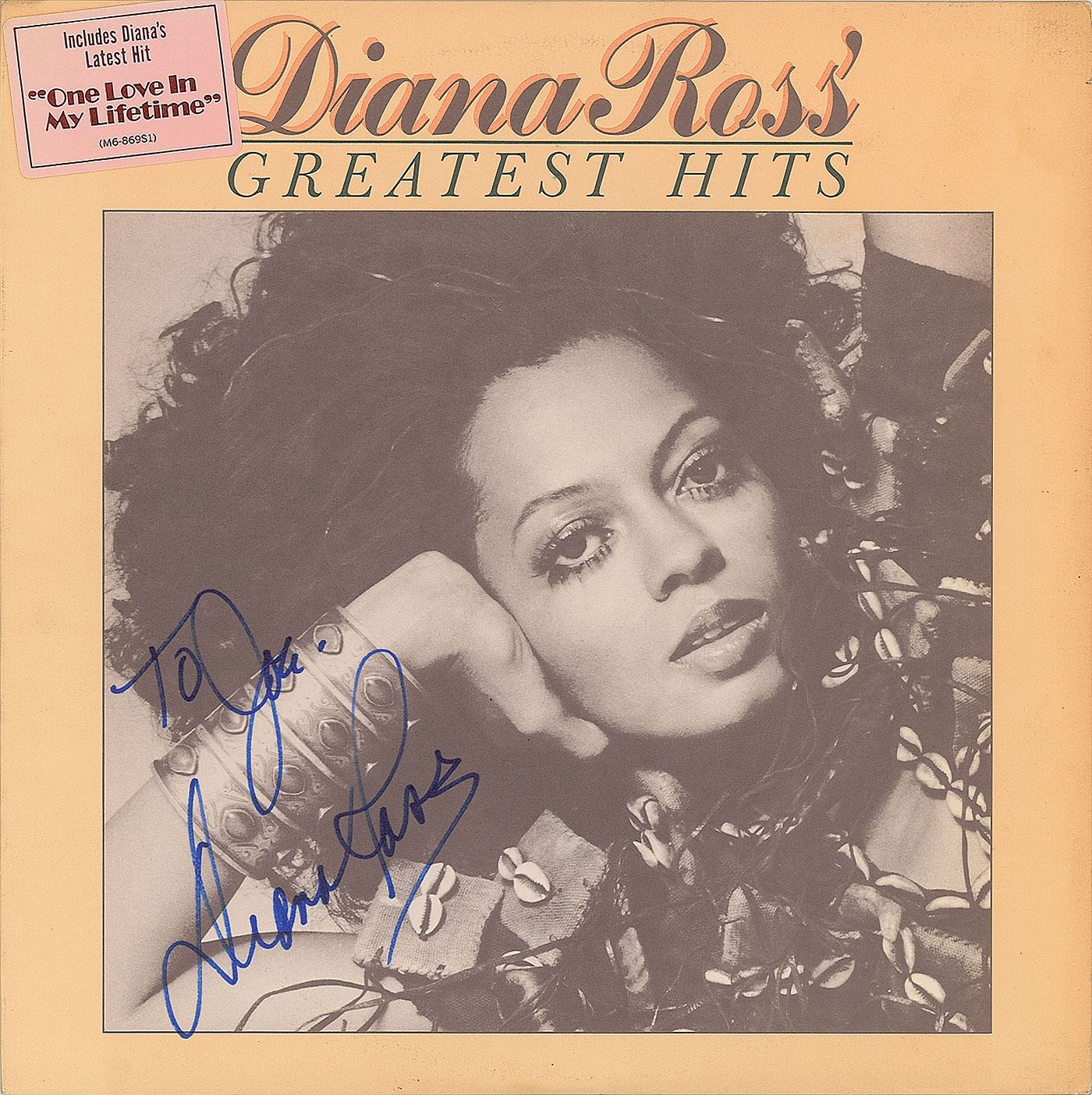 Diana Ross' Greatest Hits album signed and inscribed on the front cover in blue felt tip, "To Joe, Diana Ross." In fine condition. The record is included. Consignor notes that the signature was obtained at Cleveland's Renaissance Hotel before her show at the Palace Theater.