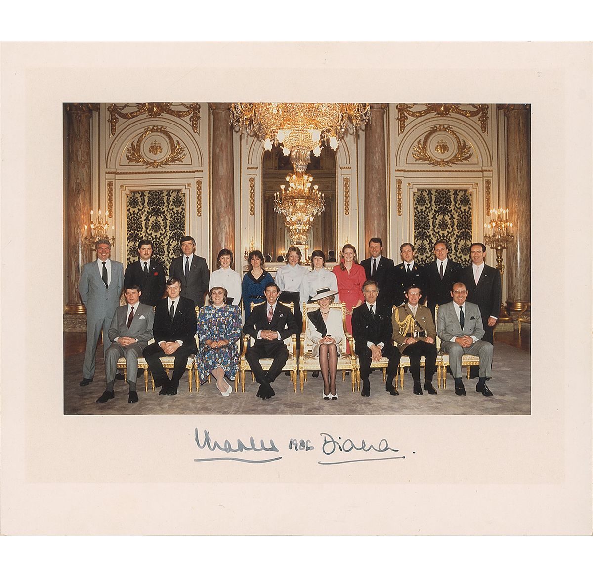 Color satin-finish 9.25 x 6.25 photo of Charles and Diana seated with their staff, affixed to its original 12 x 10 mount, signed on the mount in black ink, “Charles 1986,” and “Diana.” In fine condition, with a mild shade of toning around image and over signatures from previous display. At this point in their marriage, Charles had restarted his relationship with Camilla Bowles, and Diana was emerging as a worldwide figure, and spending less time with her husband.