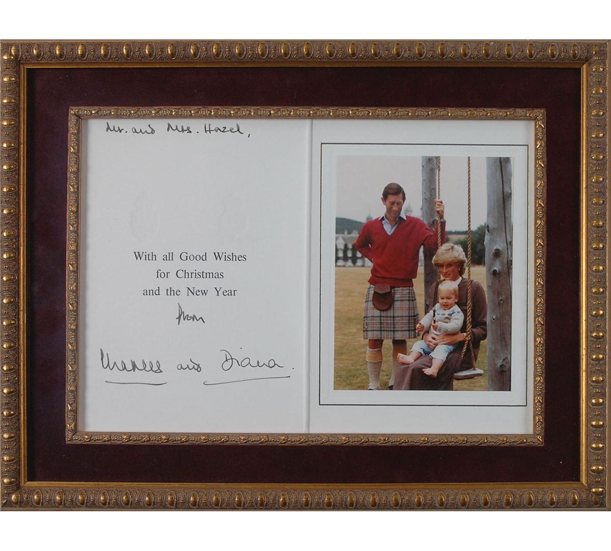 Christmas card from 1983, 10.5 x 7.25 open, embossed in gold on the outside with the Prince of Wales’s feathers and Garter motto, as well as the Spencer family arms. Inside, the card bears an affixed charming satin-finish 4 x 5.5 color casual family photograph of Charles, Diana and baby William at Balmoral, with William sitting on Diana’s lap on a swing as Charles looks on. Printed opposite the photograph is the sentiment “With all good wishes for Christmas and the New Year.” Charles has inscribed the card at the top, “Mr. and Mrs. Hazel,” and signed at the bottom, “Charles and,” after which Diana has signed “Diana.” Suede-matted and framed to an overall size of 13.75 x 11. In fine condition.